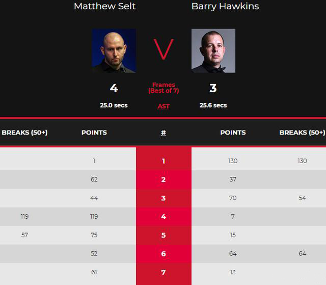 比赛开始后霍金斯轰出单杆130分、54分取得2-1的领先优势,马修-塞尔特轰出单杆119分、57分连两局3-2成功反超比分。