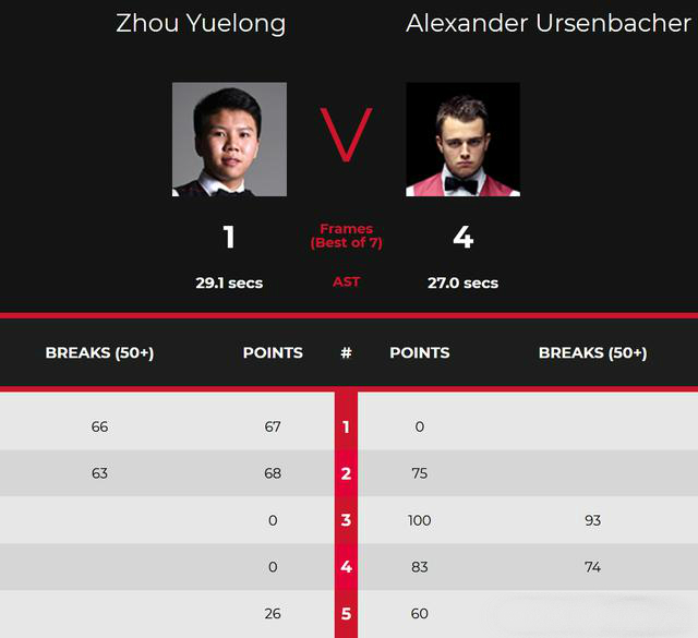 第五局双方进行长时间的防守大战,乌森巴赫多次上手60-26锁定胜利,就这样周跃龙连丢四局溃败,1-4不敌乌森巴赫爆冷出局止步64强。