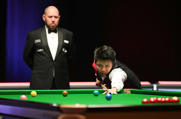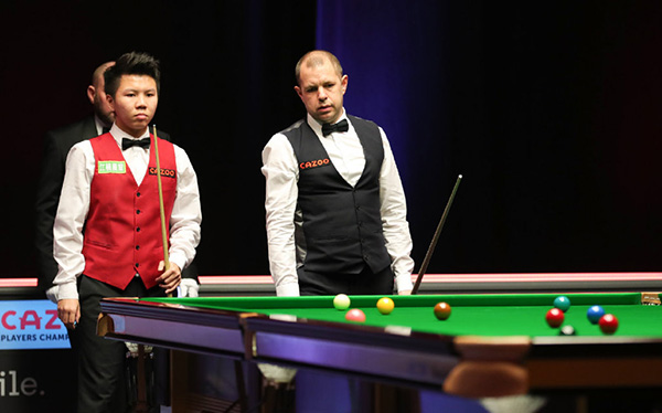 第五局,周跃龙单杆破百109分!3-2再度取得了领先。第六局,周跃龙77-1再胜一局,总局分4-2领先。第七局霍金斯打出一杆破百,攻下109分以129-6胜出。第八局霍金斯单杆拿下57分后,以95-37再下一城追至4-4。第九局霍金斯先拿15分,周跃龙利用对手失误的机会,一杆得到85分,5-4先拿赛点。