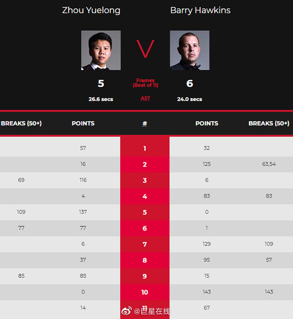 第十局,巴里霍金斯狂轰单杆143分,在挽救赛点的同时,也超越了尼尔罗伯逊的单杆142分,成为本届赛事至今为止的单杆最高分,有望去获得单杆最高分奖金!决胜局,周跃龙红球致命失误,巴里霍金斯实现超分,结束了整场比赛!