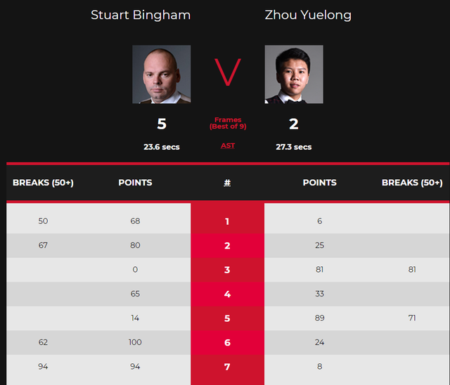 第五局,周跃龙单杆71分以89:14拿下此局将比分改写为2-3落后宾汉姆。第六局,宾汉姆轰单杆62分以100:24拿下此局4-2领先周跃龙拿到赛点。第七局,宾汉姆以单杆94分的表现94:8拿下此局以5-2击败周跃龙轻松闯进第二轮比赛。