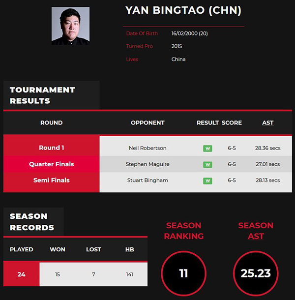 15分钟局间休息后,第5局中颜丙涛终于通过一杆长台率先上手,连得8分后防守出现摔袋,此后颜丙涛两度通过长台上手,24-2后贴咖啡球做防守。宾汉姆解球罚分直接漏中袋,颜丙涛随后围球打到超分拿下这局,扳回一局总分2-3落后。