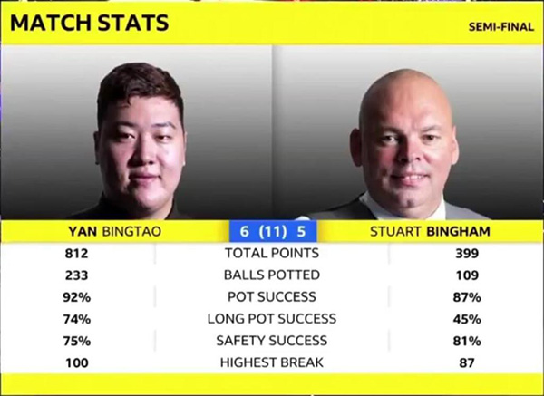 决胜局中,颜丙涛拼进一杆长台上手,连得7分后中袋蓝球出现失误,随后宾汉姆拿下8分后反切底袋红球失误。颜丙涛获得非常好的上手机会,单杆拿下65分超分后中断,随后宾汉姆连得16分后最后一颗红球做斯诺克。颜丙涛被罚掉一杆,随后拼进红球拿下这局,总分6-5颜丙涛连续三场上演绝杀好戏,成功挺进大师赛决赛。