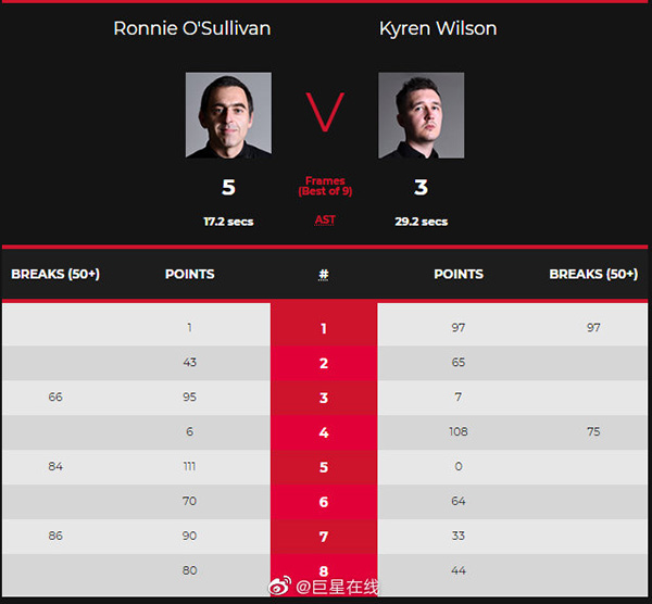 下半场威尔逊失误增多,给了奥沙利文更多的机会。第五局,奥沙利文上手打出一杆84分,以111-0零封追上一局。第六局威尔逊本有机会拿下,结果却在叫位最后的粉球时出现失误,母球不仅未能打到粉球还被罚6分。奥沙利文打进粉球和黑球,以70-64逆转追至3-3。关键的第七局,威尔逊打到33-4时又一次在粉球上犯错,奥沙利文单杆86分以90-33拿下,4-3反超获得赛点。第八局奥沙利文一鼓作气,以80-44再下一城,连扳四局总比分5-3逆转威尔逊。
