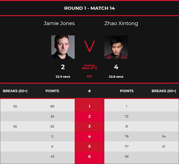 比赛首局,琼斯打出单杆65分,以89比1给赵心童来了个下马威,第二局,琼斯防守中多次漏球,赵心童几番上手之后,以72比39扳平比分,第三局,琼斯再次打出单杆65分将比分改写成2比1,这也是他本场比赛的最后一次领先,随后进入了赵心童的表演时间,第四局,赵心童单杆轰出54分,以78比0追平比分。第五局,赵心童持续火热手感,凭借单杆61分再下一城,以3比2的比分率先拿到赛点,第六局,赵心童再接再厉,多次上手以58比43赢下,从而以4比2的总比分击败琼斯,顺利晋级16强。
