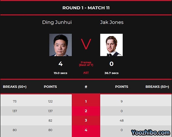 第三局,丁俊晖0-48落后之时开始上手,打进底袋红球之后,丁俊晖连续围黑球得到47分之后却失误了,好在没有太好的机会留给对手。随后,两人都有失误,耗时较长,丁俊晖最终通过一杆斯诺克得到了上手机会,并拿下了本局,将总局分带到3-0领先,拿满了赛点。第四局,中国球王保持手感,继续冲击满分杆,他接连打进10红10黑成功解开球型,突然在第11颗红球进攻底袋的时候出现失误,这个红球难度并不高,打丢的丁俊晖气得直跺脚,结果凭借一杆80分,丁俊晖直落四局横扫琼斯,晋级第二轮。