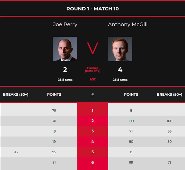 双方大战一触即发,实力接近的比赛,让两个人打得并不顺畅,一上来两个人进入防守大战,麦克吉尔率先发力,可惜决胜时刻失误不断,给了乔佩里逆转机会,0比1,随后的三局比赛,麦克吉尔强势来袭,连下三城,3比1,尽管乔佩里艰难扳回一局,随后的比赛麦克吉尔一鼓作气锁定胜局,将乔佩里淘汰出局!麦克吉尔强势晋级世界大奖赛16强!