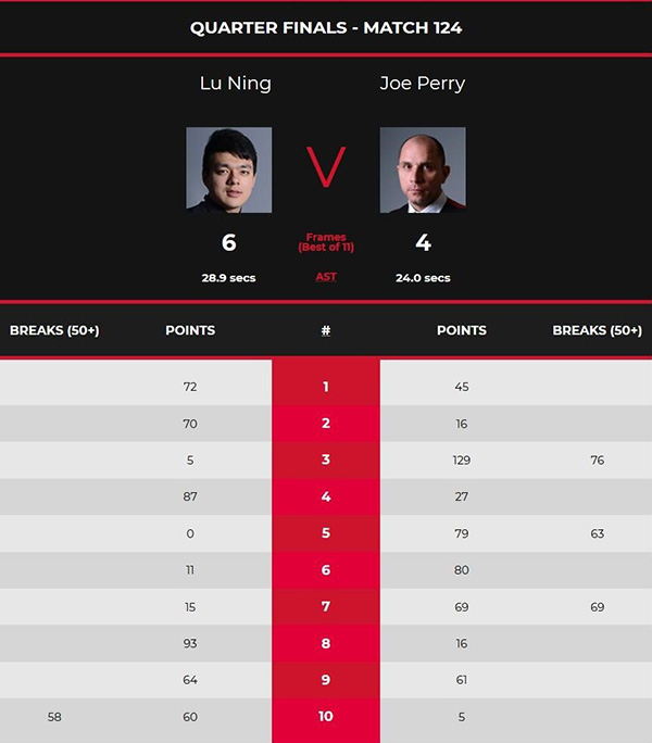 前两局鲁宁在乱战中把握住局面,先后以72-45和70-16获胜。第三局佩里打出一杆76分,以129-5追上一局。第四局鲁宁几次上手,以87-27再下一城3-1领先。下半场第五局,佩里单杆63分以79-0零封,第六局多次上手以80-11拿下追至3-3。第七局,鲁宁先得15分失误,佩里一杆69分逆转,连赢三局4-3反超。第八局鲁宁夺回场上主动,以93-16拿下追至4-4。第九局鲁宁完成单局逆转,以64-61取胜5-4拿到赛点。第十局一番防守争夺后,鲁宁打出一杆58分,以60-5取胜总比分6-4击败佩里。