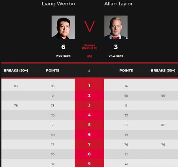 第五局,两人互送失误,泰勒上手扩大领先优势顺利拿下,梁文博3-2,本局泰勒打出了单杆101分。第六局,梁文博36-0中断,随后又出现失误,泰勒上手打到11分后失误,梁文博53-11后再次中断。泰勒再漏机会,梁文博上手60-19拿下,4-2领先。第七局,泰勒单杆76分一杆制胜再追一局。第八局,梁文博再度发力,他以70-21胜出,比分来到5-3,并率先赢得本场比赛的赛点。第九局,梁文博以87-41锁定胜局,总比分6-3战胜对手,晋级第二轮!