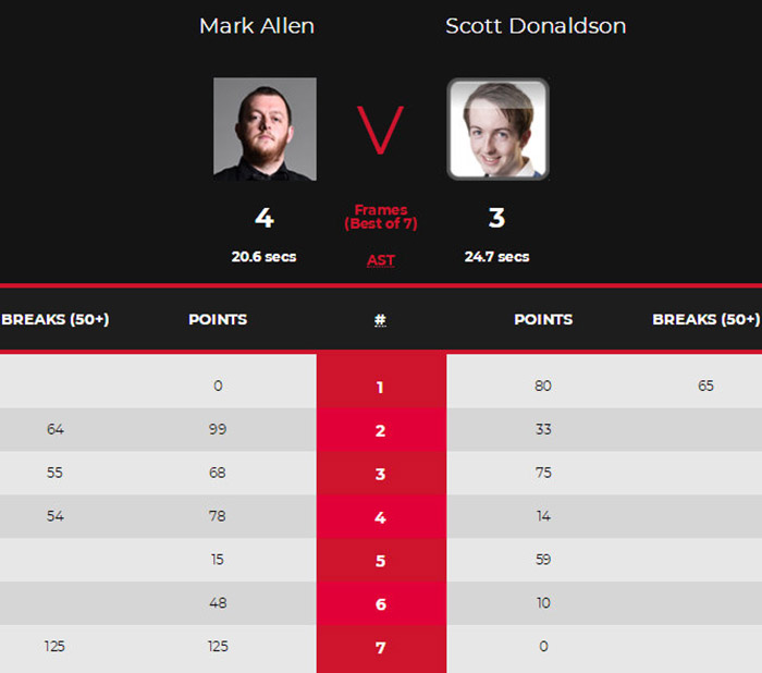 比赛采用7局4胜制,首局艾伦没有进球,唐纳森打出单杆65分80-0先拔头筹,第二局双方互有失误,艾伦抓住关键期机会,打出单杆64分99-33还以颜色。
