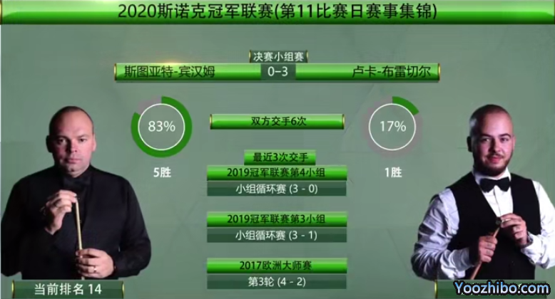本次赛事比赛进行到最后一个比赛日,宾汉姆(世界第13)、布雷切尔(世界第37)、瑞恩-戴(世界第36)和沃拉斯顿(世界第38)展开冠军组的争夺,四人打循环赛,和之前一样:胜者积3分,平局积1分,负者0分,且每场最多打满四局,头名才能夺冠。单说世界排名,宾汉姆是四人中唯一一个TOP16选手,自然也被看好夺冠。不过,连奥沙利文、特鲁姆普两大夺冠热门都能提前爆冷被淘汰,还有什么不可能发生呢?果不其然,宾汉姆未能夺冠,甚至是提前无缘。