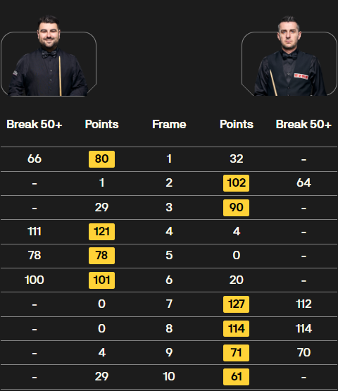 第六局,塞尔比重新找回了进攻的节奏,他通过一杆精彩的长台进攻上手,然后展开了凌厉的攻势,单杆打出了较高的分数,顺利拿下这一局,以 4-2 的比分再次扩大领先优势。