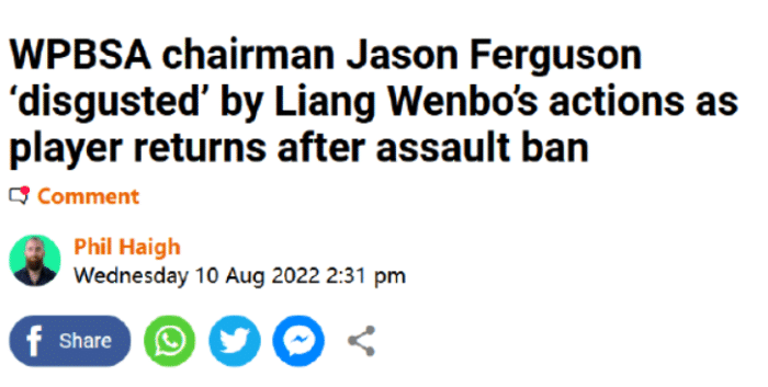不过世界台联并没有就此饶过梁文博,对他处以4个月的禁赛。这也让梁文博直接退出了世锦赛资格赛的争夺,无缘世锦赛正赛,也提前结束了2021-22赛季。8月1日,梁文博的禁赛期满可以复出,他也报名参加了英格兰公开赛资格赛。不过,作为世界台联掌门人的弗格森,依然对梁文博的行为耿耿于怀。