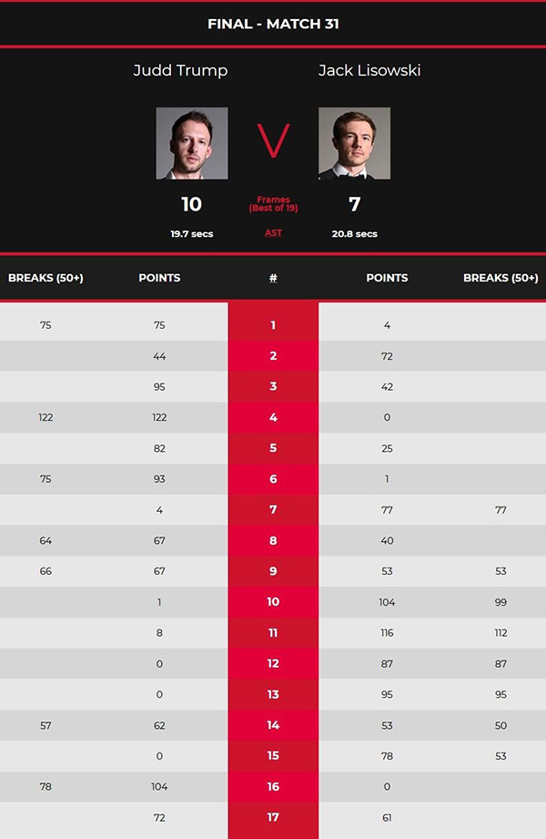 第十四局,特鲁姆普终于顶住了压力,重新找回准度,62-53完成单局大逆转,8-6。第十五局,利索夫斯基单杆53分,78-0拿下。第十六局,特鲁姆普单杆78分,104-0还以颜色,9-7带出赛点。第十七局,利索夫斯基出现失误,特鲁姆普单局大逆转,大分10-7夺冠!