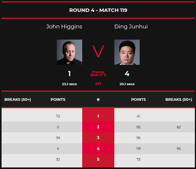 这是双方在本赛季第3次交手,前面两次手当中,希金斯分别在英格兰公开赛第4轮以总比分4-1将丁俊晖挡在8强大门之外;但在接下来的王中王小组赛,丁俊晖4-3将之绝杀。双方此役再战,丁俊晖在先失一局的情况下,先后轰出单杆82分、95分连扳4局,以总比分4-1反扫对手杀进8强成功会师奥沙利文。