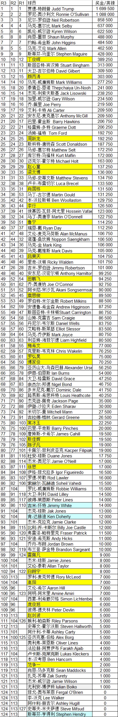 附表:具体排名如下:(排名最终以世界斯诺克官网公布的为准)