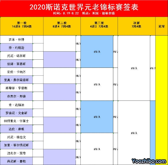 2020年斯诺克元老世锦赛对阵出炉:怀特、亨德利领衔