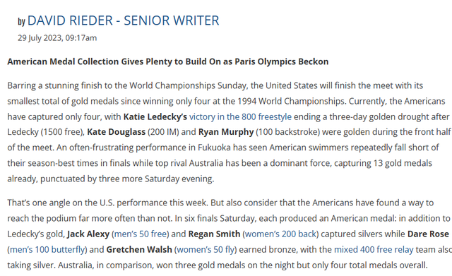 最后,作者总结道:“福冈对于美国队来说,并不是一次失败。16枚银牌和11枚铜牌(游泳项目),为队伍提供了充足的发展空间,同时对于最优先考虑的比赛会产生期待,这就是巴黎奥运会。年轻的游泳运动员通过登上领奖台感受国际比赛的氛围,没有夺冠是可以接受的结果。”