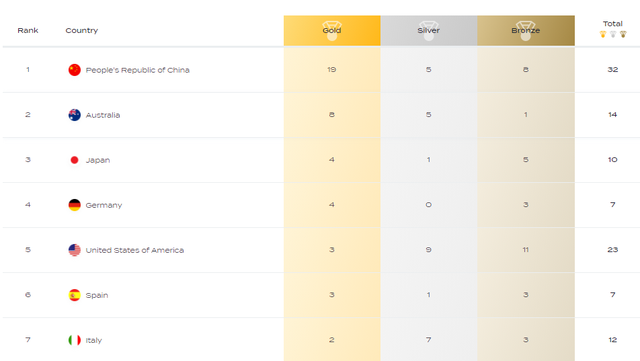 上届世锦赛,中国队18金创造历史。如今,中国队已经拿到19金,再度刷新历史纪录。而美国队上届赛事18金排名奖牌榜第一,但本届比赛在剩余27枚金牌的情况下,美国队想要追上中国,几乎已经没有可能。