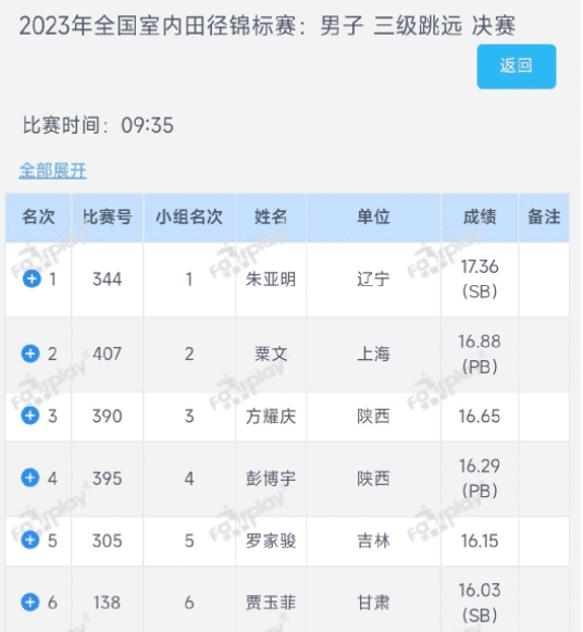 来源:JRS直播网03-17 16:06JRS直播网03月16日讯全国室内田径锦标赛继续进行,男子三级跳远落下帷幕,最终辽宁选手朱亚明第三跳17米36,成功夺得冠军。这位东京奥运会银牌、世锦赛铜牌获得者表现强势,创造PB。亚军属于来自上海的粟文,他跳出了16米88,也创个人PB。第三名属于陕西的方耀庆,他的成绩是16米65。