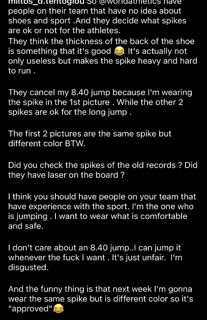 得知自己成绩被取消之后,滕托格罗直接炮轰世界田联,怒斥世界田联没有方面专业的人,而是觉得这个鞋子对成绩有帮助就禁止。同时滕托格罗还表示同样的款式换个颜色就能用。黑金色可以,但黑绿色就可以用,确实非常滑稽:“我不在乎8米40的成绩,我TM随时想跳都能跳,可以3次没测药检但不能穿这个鞋”