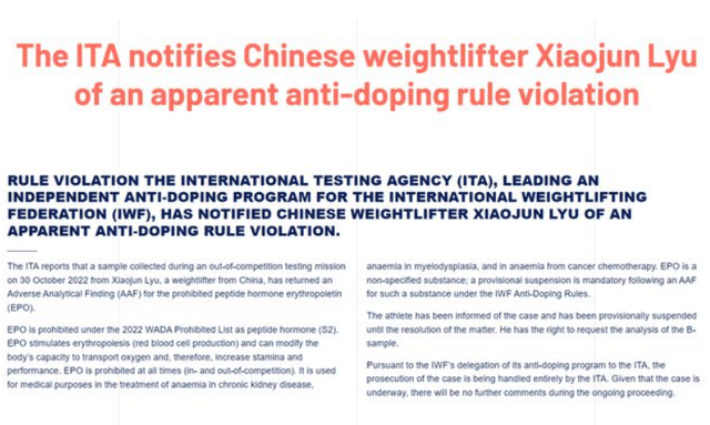 在国际兴奋剂检测机构最新发布的一份公告中显示,吕小军在今年10月30日的赛外检测提供的样本中,被检出促红细胞生成素(EPO)。EPO早已经被列入禁药名单,运动员在任何时候都都不得使用该物质。因为EPO可以刺激红细胞生成,并提升体运输氧气的能力,从而增加耐力和表现,对于举重这项运动来说,会造成混乱和不公平。