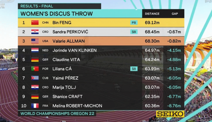 来源:JRS直播网07-21 14:46JRS直播网07月21日讯 ,俄勒冈田径世锦赛传来喜讯!在女子铁饼决赛中,中国选手冯彬凭借第一掷投出的69米12,以刷新个人最好成绩的方式夺得金牌!这也是中国铁饼时隔11年在该项目上再度夺得世锦赛金牌。这一块金牌,冯彬也创造了多项纪录!