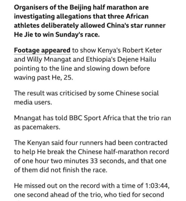 北京时间4月16日,3位非洲选手之一的威利·姆南加特(Willy Mnangat)告诉BBC体育非洲频道(BBC Sport Africa),他们三人并不是本次北京半程马拉松赛的正式参赛选手,而是作为“配速员”参与跑步的。