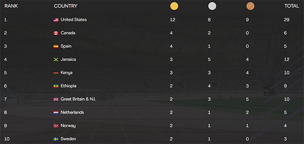 世锦赛奖牌榜,美国队12金8银9铜第一,加拿大队4金2银位居第二,西班牙队4金1铜排名第三,牙买加3金5银4铜排名第四。肯尼亚、埃塞俄比亚排名身后。