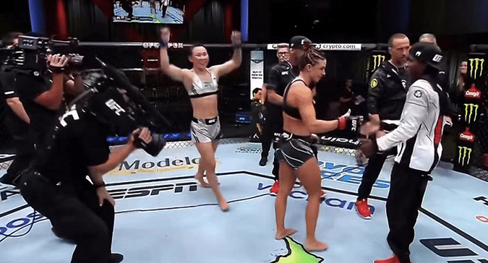 来源:JRS直播网10-02 16:09JRS直播网10月02日讯 ,UFC格斗之夜,闫晓楠大战“柔术女神”邓恩,这是中国女子选手首次海外领衔头条主赛。闫晓楠拿下第一、三、四回合,通过多数判定击败邓恩(48-47, 48-47, 47-47)。比赛期间,闫晓楠多次挣脱邓恩的降服,她防守做得不错,有效击打更多,双方战至五局,最终判定闫晓楠胜利,排名升至前五。