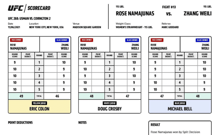这场比赛中,罗斯和张伟丽也是互有优劣势,现场三位裁判分别给出48-47,47-48,49-46的打分,罗斯卫冕成功。不过这也引发了一定的争议,因为张伟丽在前三个回合是占据明显优势的,第四个回合也并不太处于下风,当然最后一个回合确实被对手压制,这样的情况下张伟丽是有机会获胜的,可裁判的判罚却是张伟丽负,就连华裔篮球巨星林书豪都在社交媒体上表示自己是裁判的话,是张伟丽获胜。
