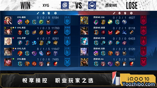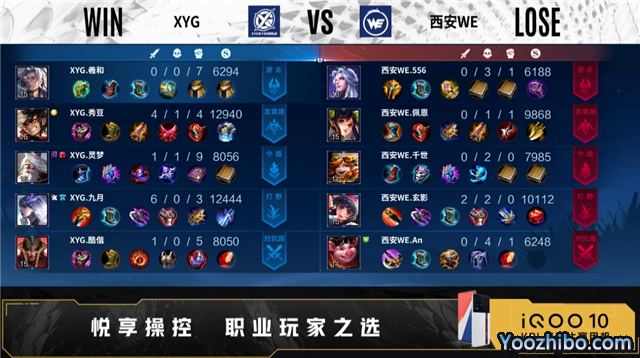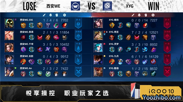 开局双方正常抢线。1分22秒XYG击杀太乙真人,拿下一血,打出0换2。2分05秒XYG拿下暴君。3分21秒中路西安WE击杀王昭君,打出0换1,XYG拿下主宰,摧毁敌方对抗路外塔。5分15秒西安WE摧毁敌方发育路外塔,野区XYG击杀不知火舞,摧毁敌方中路外塔。5分47秒野区XYG击杀曜,澜二连击破,摧毁敌方中路二塔,拿下暴君。6分57秒XYG摧毁敌方发育路外塔、二塔,8分03秒摧毁敌方对抗路外塔。8分38秒对抗路西安WE击杀廉颇,XYG虞姬二连击破,打出1换2,摧毁敌方对抗路高地。9分30秒XYG拿下主宰。9分51秒发育路XYG击杀公孙离,打出1换3,摧毁敌方发育路高地。11分12秒XYG拿下暗影主宰、暗影暴君。12分15秒中路西安WE击杀虞姬,打出1换2。12分59秒野区XYG击杀曜,双方打出2换2。14分57秒XYG拿下暗影主宰,15分35秒拿下暗影暴君。16分03秒XYG摧毁敌方中路高地,击杀太乙真人,虞姬三连决胜,打出1换4,摧毁水晶拿下比赛。