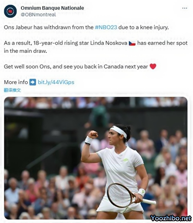 来源:JRS直播网07-27 11:06JRS直播网讯北京时间7月26日,据WTA官方消息,温网女单亚军、突尼斯选手贾巴尔宣布因膝伤退出下个月开赛的WTA1000蒙特利尔站(即罗杰斯杯)。