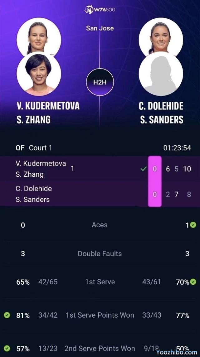来源:JRS直播网08-05 11:36JRS直播网08月05日讯 结束的WTA500圣何塞站女双1/4决赛的一场焦点战中,头号种子、中国选手张帅与搭档库德梅托娃,以2-1艰难淘汰多勒海德/桑德斯,率先晋级四强。