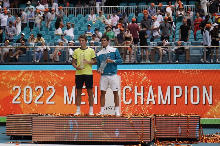 来源:JRS直播网04-06 20:00JRS直播网04月06日讯 上周日,18岁的阿尔卡拉斯成为迈阿密公开赛历史上最年轻的冠军,也是史上第三年轻的大师赛冠军得主。这一胜利对这位西班牙人来说是一个星光闪耀的赛季开始,他之前也成为了里约热内卢ATP 500赛事历史上最年轻的冠军。目前,他已经在对阵前10名选手中取得了7场胜利。这位世界排名第11的选手被誉为未来的世界第一,有一天他很可能会取代他的偶像纳达尔成为西班牙网球的领袖。尽管纳达尔目前没有打算在短期内退役,但一位前大满贯决赛选手相信,他的年轻同胞会刺激纳达尔在巡回赛上更加努力。