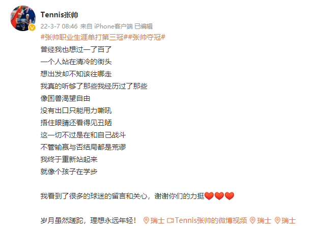 来源:JRS直播网03-07 16:36JRS直播网03月07日讯 ,WTA巡回赛里昂站结束了决赛争夺。中国金花张帅面临顶住场内外的巨大压力,2-1逆转击败乌克兰选手雅斯特雷姆斯卡,时隔5年再夺WTA巡回赛冠军,也是生涯首次在海外夺冠。而张帅也通过社交媒体分享了自己夺冠的心情,张帅表示:“岁月虽然蹉跎,理想永远年轻!”