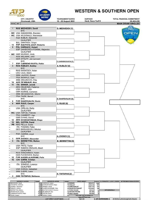 来源:JRS直播网08-15 16:47JRS直播网讯 罗杰斯杯将于明天决出最终的冠军,而马上接档而至的辛辛那提大师赛也于昨日公布了男单正赛签表。