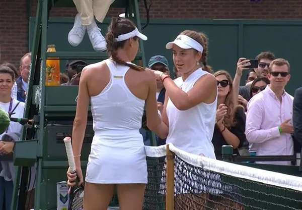 比赛打完了,奥斯塔彭科6-4、4-6、2-6被汤姆贾诺维奇逆转,她们俩赛后按照规则握手。