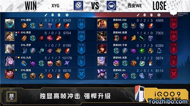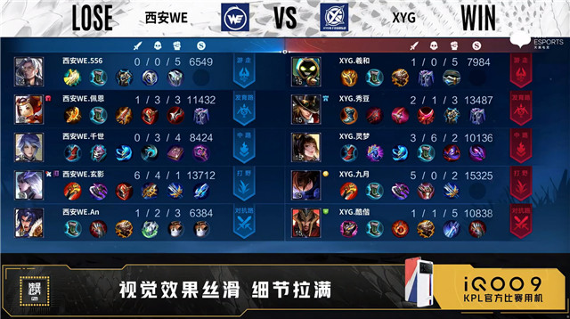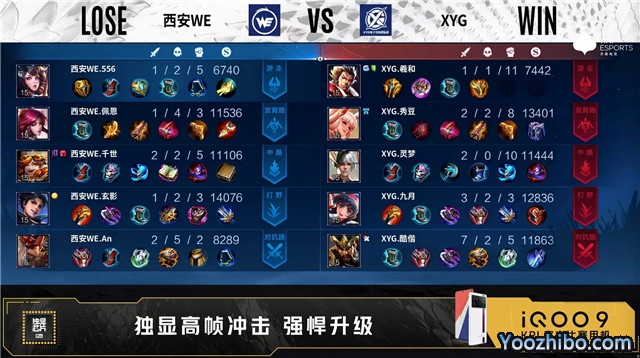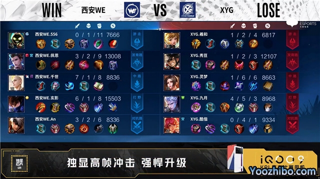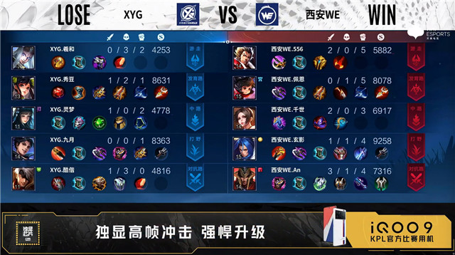 双方常规开局。2分38秒西安WE拿下暴君。3分04秒西安WE对抗路击杀猪八戒拿到一血。4分15秒主宰处团战XYG打出1换2。5分整XYG野区击杀马可波罗。5分55秒西安WE拿下主宰。7分07秒双方野区1换1。7分54秒西安WE拿下暴君。9分35秒XYG野区打出0换2。9分50秒XYG主宰处击杀马可波罗。10分整XYG野区击杀铠。10分21秒XYG拿下暗影主宰。11分12秒XYG拿下暗影暴君。11分51秒XYG摧毁敌方对抗路二塔。12分06秒高地团战XYG打出0换2。12分33秒XYG摧毁敌方水晶拿下比赛。