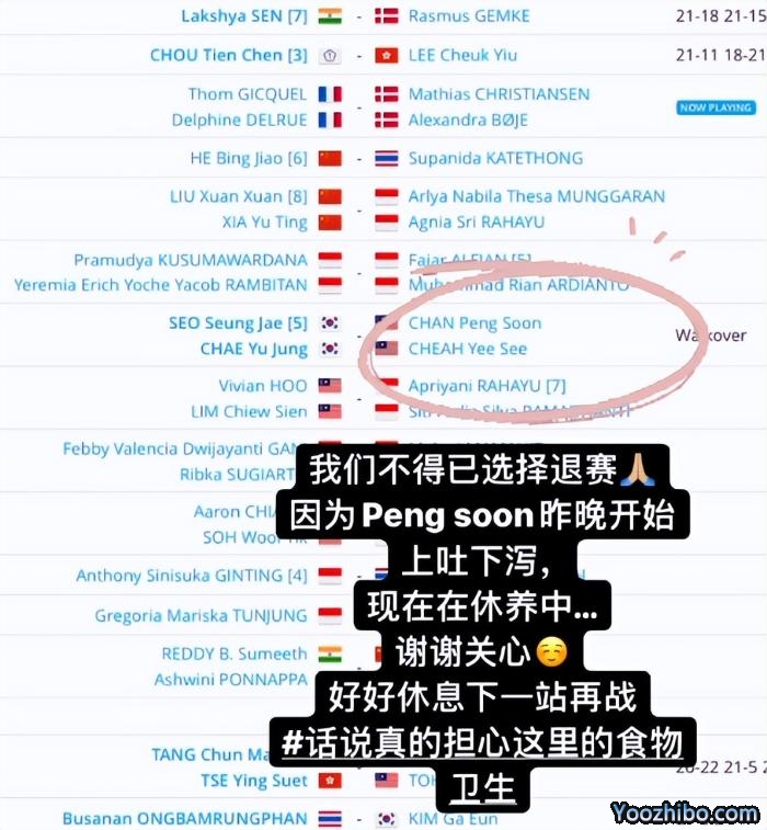 另一位退赛的是陈炳橓,这位马来西亚名将和谢宜茜第一次组成出战世界大赛,而且还击败了与自己一起夺得奥运会银牌的吴柳莹和宋浚洋,没想到的是胜负没有阻挡陈炳橓前进的脚步,反倒是吃的东西,导致陈炳橓食物中毒,反而无奈退赛。