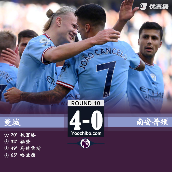 JRS直播网讯北京时间10月8日22:00,2022-23赛季英超联赛第10轮,曼城坐镇伊蒂哈德球场迎战南安普顿。上半场哈兰德单刀球中柱,坎塞洛建功,福登破门,曼城暂2-0南安普顿。下半场马赫雷斯进球,哈兰德再失单刀,随后他接到坎塞洛助攻取得进球,曼城4-0南安普顿。
