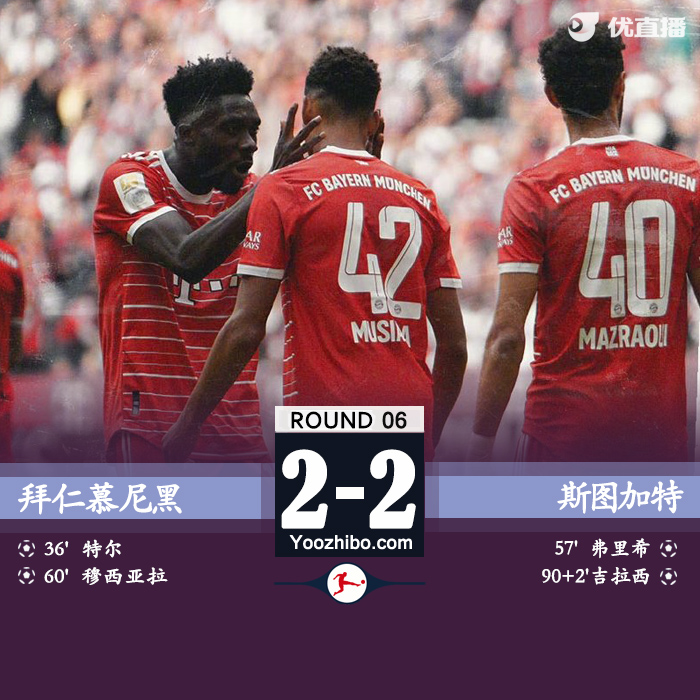 JRS直播网9月10日讯 北京时间9月10日21:30,德甲第6轮,拜仁慕尼黑主场迎战斯图加特。上半场,基米希主罚任意球稍稍打高,特尔门前包抄被扑错失良机,阿方索-戴维斯助攻特尔打入德甲处子球。下半场,弗里希反击扳平比分,穆西亚拉低射破门助拜仁超出比分,格纳布里错失单刀,德里赫特犯规送点,吉拉西点射扳平。全场比赛结束,拜仁2-2战平斯图加特,遭遇三连平。