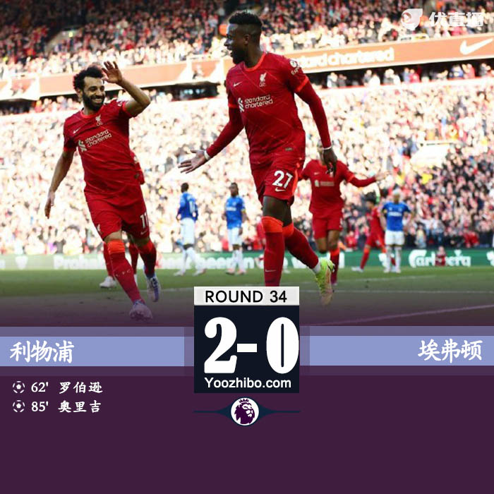 JRS直播网4月25日讯 北京时间4月24日23时30分,2021-2022赛季英超第34轮上演一场默西塞德德比战,利物浦主场迎战埃弗顿。上半场双方均无建树,利物浦半场0-0战平埃弗顿。下半场,萨拉赫助攻罗伯逊首开纪录,替补登场的奥里吉破门锁定胜局。最终利物浦主场2-0击败埃弗顿,取得联赛两连胜。此役战罢,利物浦继续排名第二,依旧落后领头羊曼城1分。