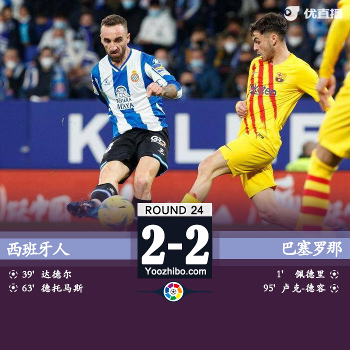 JRS直播网2月14日讯 北京时间2月14日04:00,西甲第24轮,西班牙人主场面对巴塞罗那。上半场比赛,佩德里开场进球,达德尔远射扳平。半场战罢,双方1-1战平。下半场比赛,德托马斯反超比分,武磊替补未登场,皮克补时染红,L-德容补时绝平。最终全场比赛结束,巴萨2-2西班牙人,积39分升至积分榜第四。