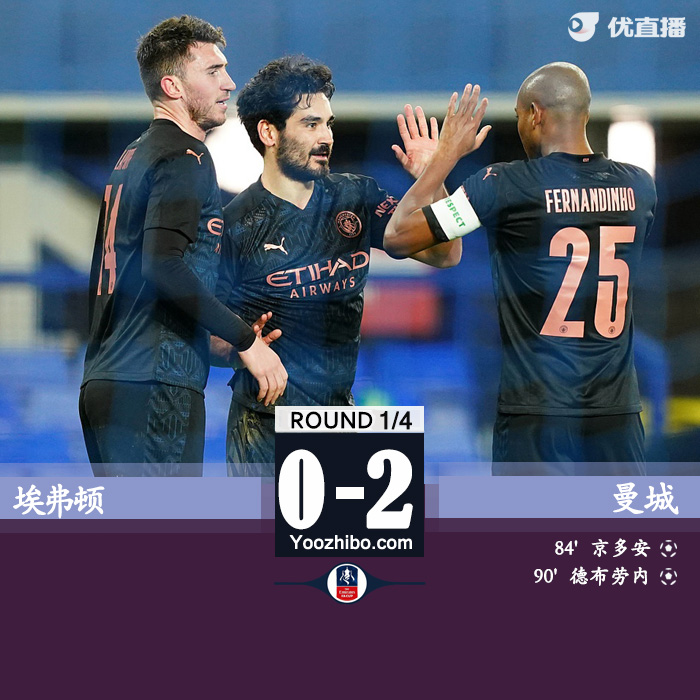 JRS直播网3月21日讯 北京时间3月21日01:30,足总杯1/4决赛,曼城客场挑战埃弗顿。上半场,两队互有攻守,津琴科门线前做出关键解围;下半场,京多安头球补射建功,德布劳内第90分钟劲射破门锁定胜局。最终,曼城2-0击败埃弗顿,进入足总杯四强。