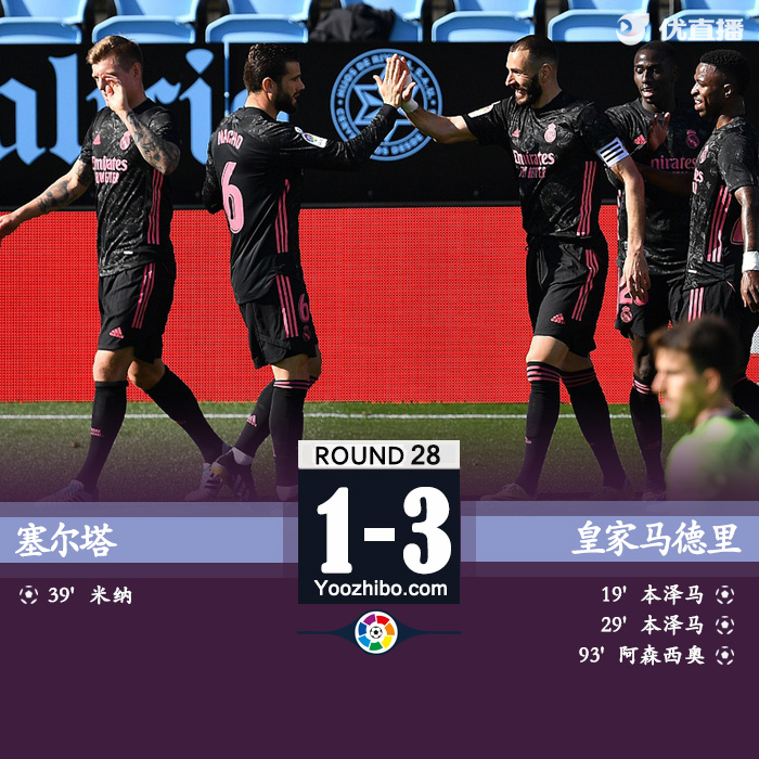 JRS直播网3月21日讯 北京时间3月20日西甲联赛第28轮,塞尔塔主场面对皇家马德里。上半场比赛,克罗斯贡献两次助攻,本泽马梅开二度,维尼修斯面对半空门失良机,米纳头球破门扳回一城,半场战罢,皇马2-1客场领先塞尔塔。下半场开始,维尼修斯利用速度屡次冲击左路遭威胁,本泽马抓住对手失误险些戴帽,补时阶段阿森西奥破门。全场比赛战罢,皇马客场3-1客胜塞尔塔。