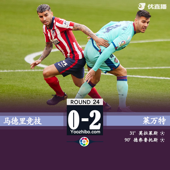 JRS直播网2月21日讯 北京时间2月20日23:15,西甲第24轮,马德里竞技主场迎战莱万特。上半场,莫拉莱斯开场错失单刀后劲射破门;下半场,吉梅内斯伤退,苏亚雷斯任意球中柱,科雷亚进球被吹,德弗鲁托斯最后时刻半场远射破门。全场比赛结束,马竞0-2不敌莱万特,仍然以6分优势领跑。