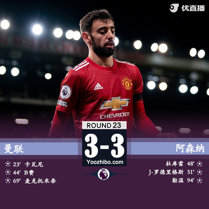 JRS直播网2月7日讯 北京时间今天4:00,英超联赛第23轮曼联在老特拉福德迎战埃弗顿的比赛准时开始。上半场拉什福德助攻卡瓦尼破门,博格巴伤退,B费进球,半场曼联两球领先。下半场回来杜库雷传射,J罗进球,麦克托米奈头球,终场补射阶段勒温垫射绝平。最终曼联3-3战平埃弗顿。