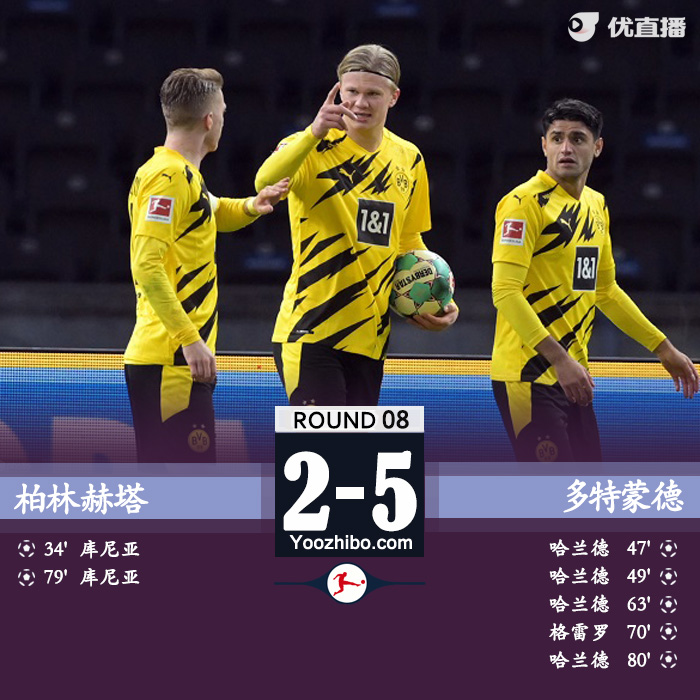 JRS直播网讯:北京时间11月22日凌晨03:30,德甲联赛第8轮,多特蒙德客场挑战柏林赫塔。上半场比赛,库尼亚远射破门。下半场比赛,哈兰德15分钟内上演帽子戏法,格雷罗捅射破门,古恩多齐造点库尼亚进球,哈兰德推射破门完成大四喜,穆科科替补登场完成首秀。最终全场比赛结束,多特蒙德客场5-2逆转战胜柏林赫塔。