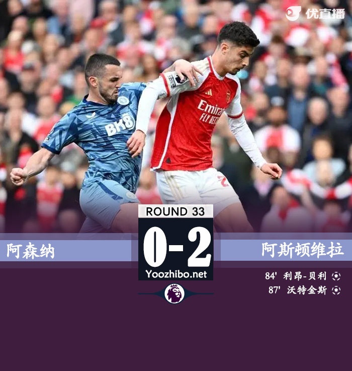 JRS直播网讯:北京时间4月14日,英超联赛第33轮,阿森纳主场迎战阿斯顿维拉。上半场,哈弗茨打门被马丁内斯挡出,萨卡小角度爆射击中边网,沃特金斯断球低射中柱,特罗萨德近距离打门被马丁内斯神勇化解,萨卡内切兜射稍偏;下半场,蒂勒曼斯远射击中横梁后反弹中柱,热苏斯推射被扑,迪涅横传助攻贝利后点包抄破门打破僵局,若日尼奥传球失误后沃特金斯接长传单刀挑射入网。最终比分为阿森纳0-2阿斯顿维拉。